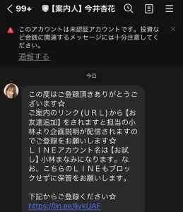 誘導サイトからは、まず今井杏花という人物のLINEへ誘導されます。