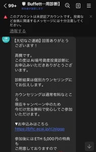すべての質問に答えると、バフェットクラブ無料カウンセリングという個別カウンセリングを案内されます。