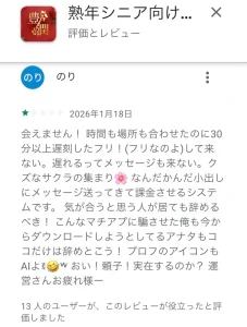 特商法や顔写真と年齢の不一致など至るところに怪しい点が見つかり、実際に課金しても会うことができない利用者が多く、課金する価値はゼロ。