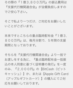 その後は振り込むために、よくわからないデタラメな名目をつけて、ビットキャッシュかアップルギフトカードを2000円分購入するよう指示されます。