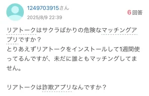 リアトークは、アプリダウンロード直後から、誘いや他のマッチングアプリに誘導してくる女性からメッセージが来ますが、すべてサクラと思ってください。