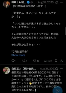 白石正人はXアカウントを精力的に運用しているようで、物販界隈ではある意味で有名な、加藤将軍と連んでいるようです。